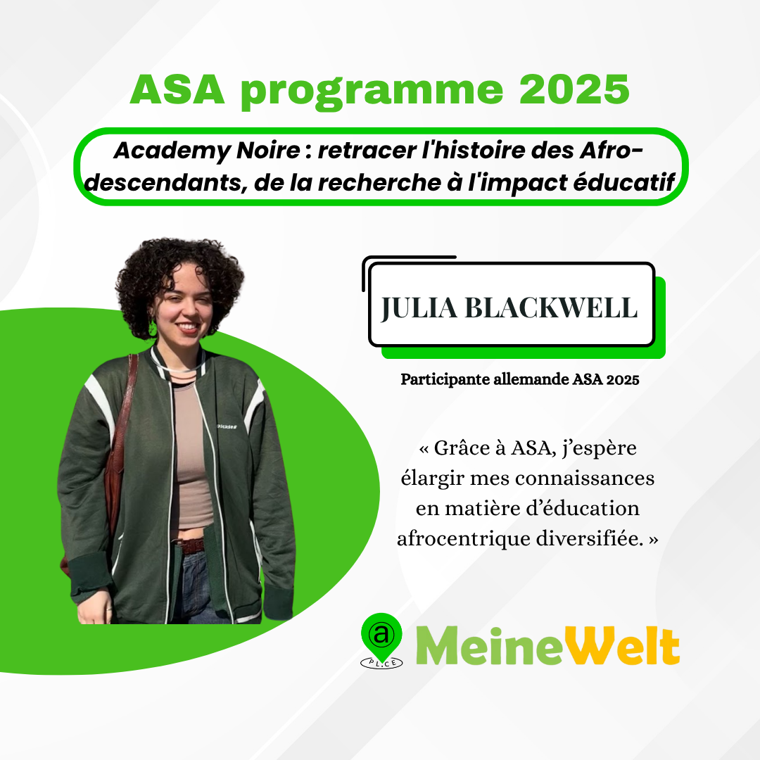 Je m’appelle Julia, je viens de Francfort, en Allemagne, et j’étudie la sociologie et l’anthropologie dans le cadre d’un baccalauréat. Je rejoindrai Meine Welt e.V. et PLACE e.V. en tant que stagiaire ASA en Allemagne pour les trois premiers mois du projet ASA : « Académie Noire : retracer l’histoire des Afro-descendants, de la recherche à l’impact éducatif ». Je passerai également un mois supplémentaire avec PLACE for Africa au Bénin.