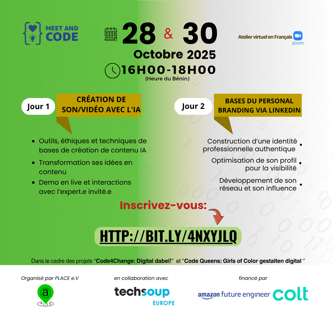 Profitez de nos ateliers Meet and Code 2025 pour booster vos compétences créatives numériques en nous rejoignant les 28 et 30 octobre de 16h-18h (Heure du Bénin) pour deux sessions interactives dédiées à la création numérique et à l’identité visuelle à l’ère de l’IA ! La participation est gratuite et ouverte à tous.tes sur inscription via ce lien : http://bit.ly/4nXYjlq