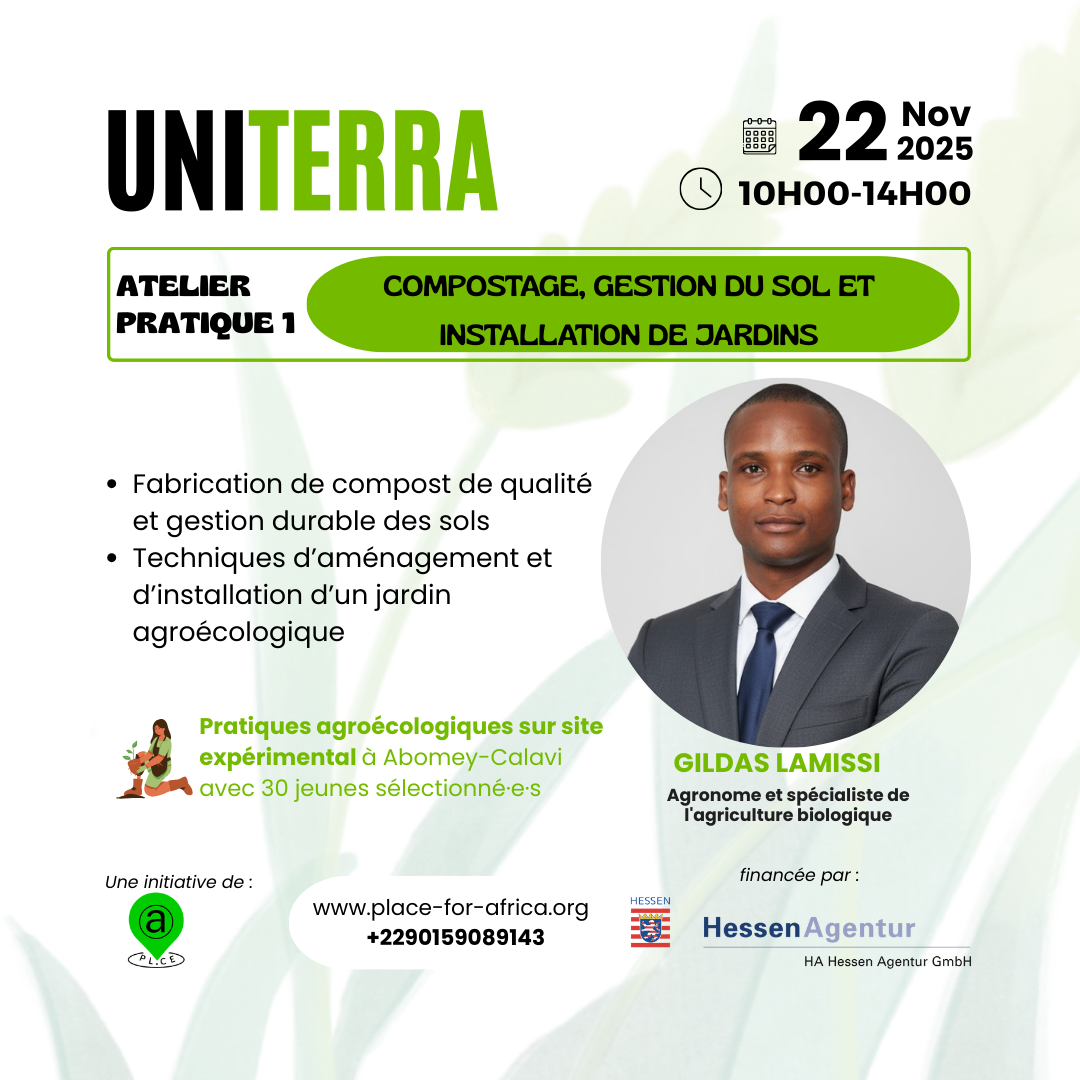 Dans le cadre de la phase pratique du projet UNITERRA, nos futur.e.s agroécologistes prendront part au premier atelier pratique le samedi 22 novembre 2025 de 10h-14h sur le site expérimental du projet à Gbodjè, Abomey-Calavi (Bénin).