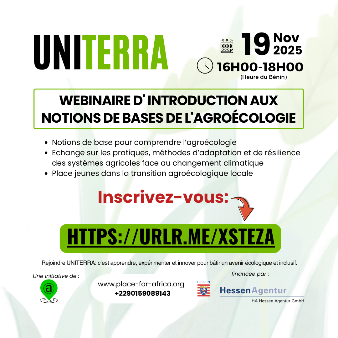 Dans le cadre du projet UNITERRA, nous t’invitons Ă  un webinaire pour dĂ©couvrir les bases essentielles de l’agroĂ©cologie ! Rejoins-nous ce 19 Novembre 2025 Ă  partir de 16h-18h30 (Heure du BĂ©nin) . Les inscriptions sont ouvertes sur https://urlr.me/XSteza